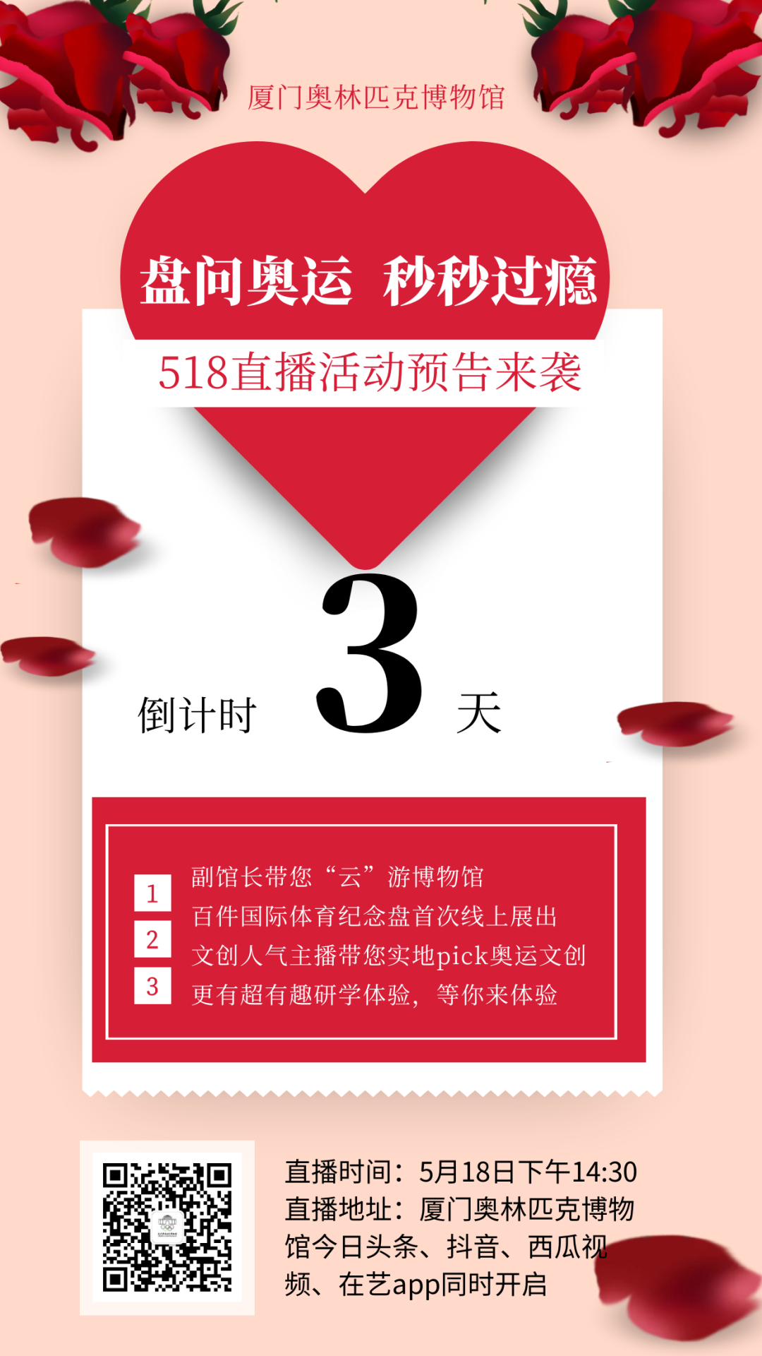 直播地址:厦门奥林匹克博物馆官方抖音、今日头条、西瓜视频、在艺 app等同步开启