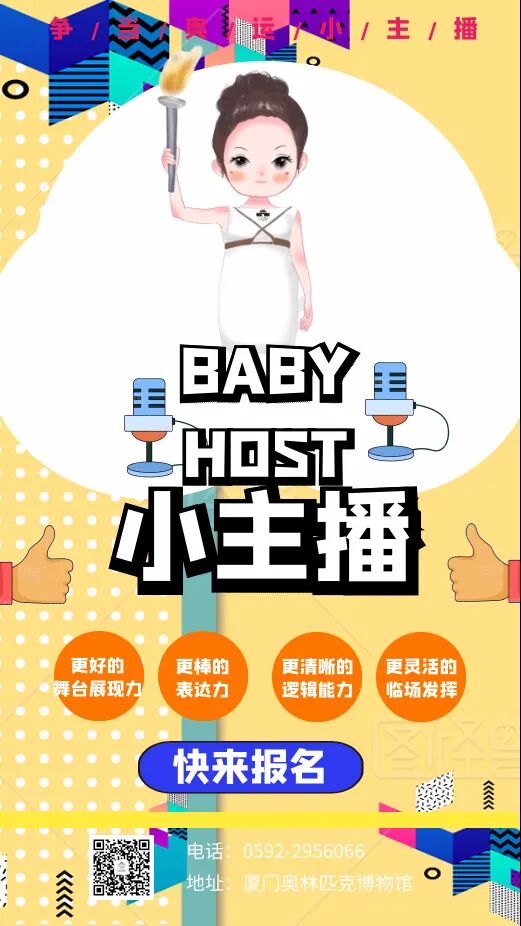 1. 公众号报名:关注厦门奥林匹克博物馆微信公众号,并回复“奥运小主播”点击报名链接进行报名。信息填写:孩子姓名+性别+年龄+学校年级+监护人姓名+监护人电话及邮箱